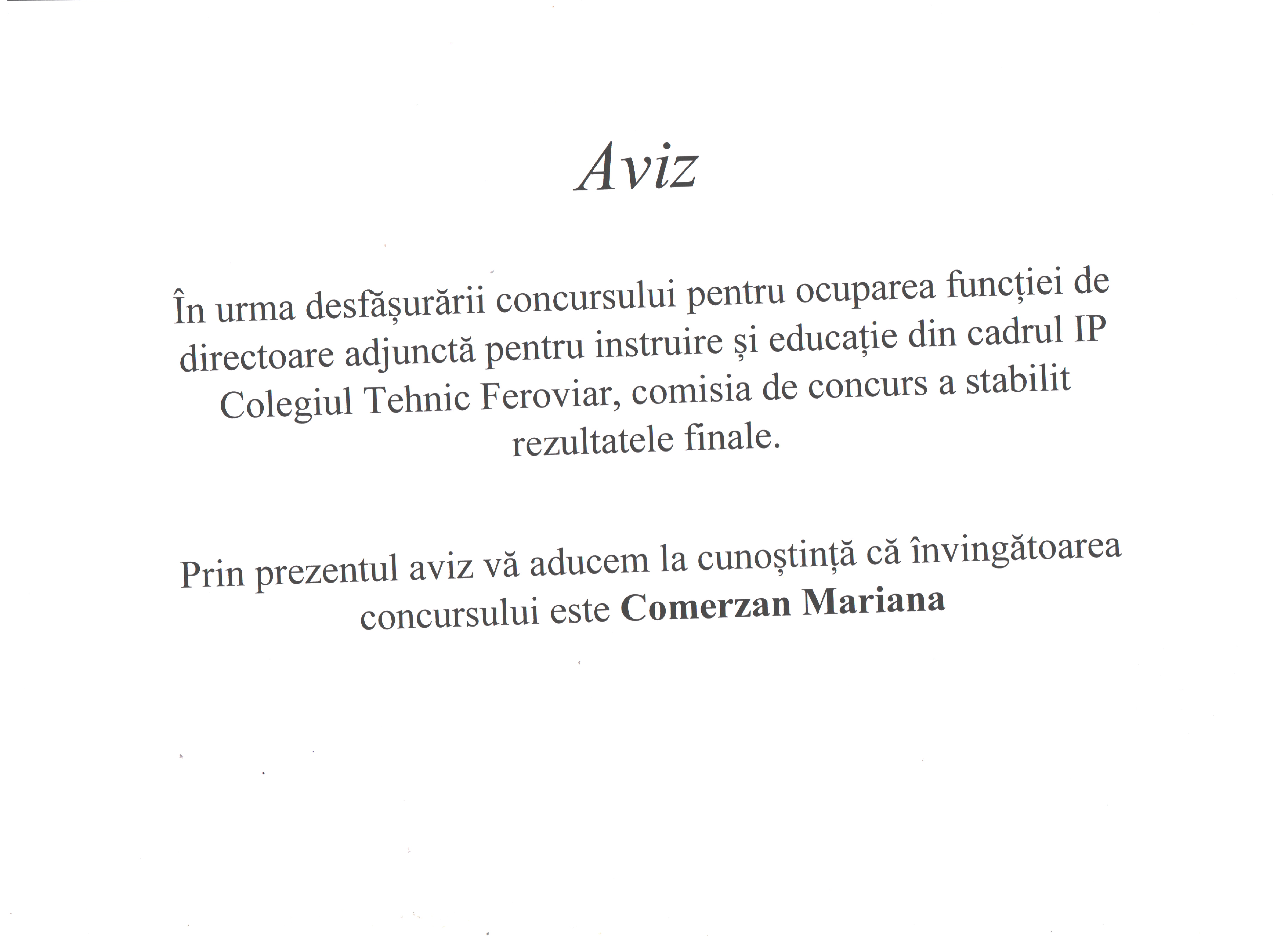 Noutati NOUTĂȚI IP COLEGIUL TEHNIC FEROVIAR DIN BĂLȚI anunță rezultatul pentru ocuparea funcției de: Director adjunct pentru instruire și educație Vă rugăm să evaluați Vot 1 Vot 2 Vot 3 Vot 4 Vot 5 Mai departe