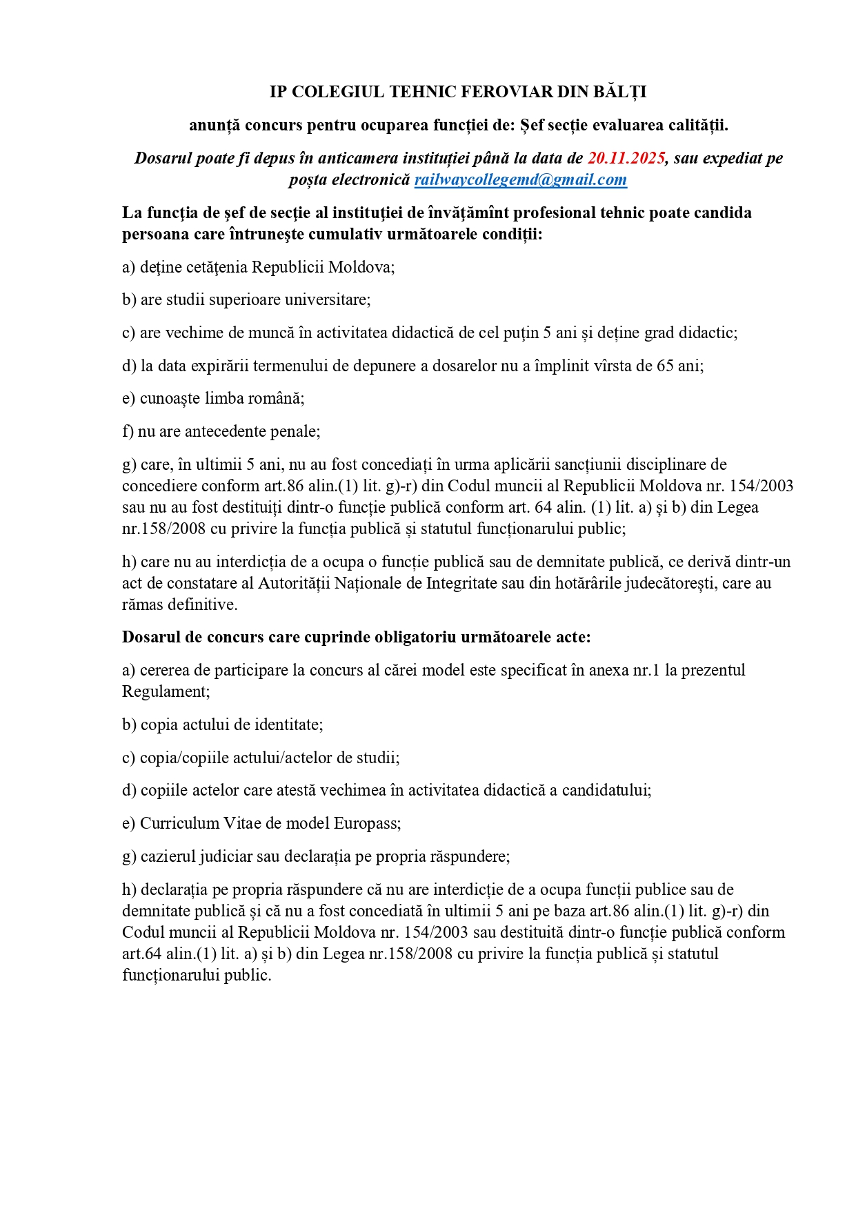 NOUTĂȚI IP COLEGIUL TEHNIC FEROVIAR DIN BĂLȚI anunță concurs pentru ocuparea funcției de: Șef secție evaluarea calității